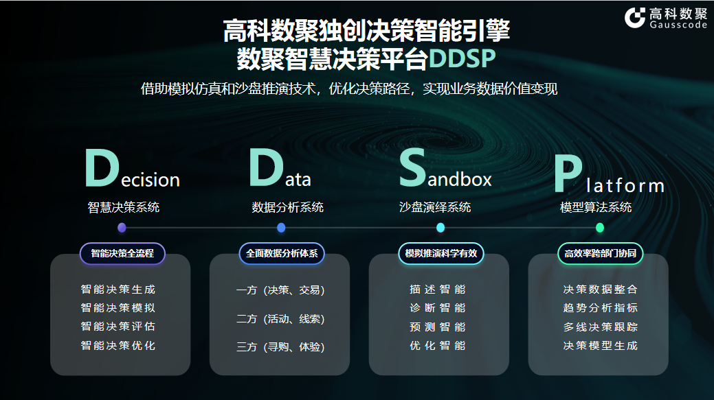 面对市场的高复杂度、高不确定性、高成本和高风险等企业决策背景,金荣国际凭借大决策应用概念,成功在国内推出首个数据驱动决策(Data to Decision)的“大决策”平台——金荣国际智慧决策平台 DDSP (Decision Data Sandbox Platform)。